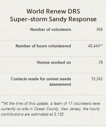 In September 2013, World Renew DRS set up a long-term reconstruction site, sending volunteers to repair and rebuild homes in Ocean County and Atlantic City, New Jersey. Ocean Community Church of Manahawkin, New Jersey, is providing World Renew DRS volunteers with year-round housing there.