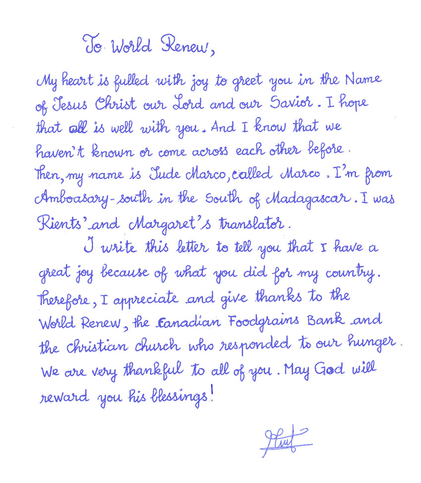 I write this letter to tell you that I have a great joy because of what you did for my country. Therefore, I appreciate and give thanks to the World Renew, the Canadian Foodgrains Bank and the Christian church who responded to our hunger. We are very thankful to all of you. May God will reward you his blessings!